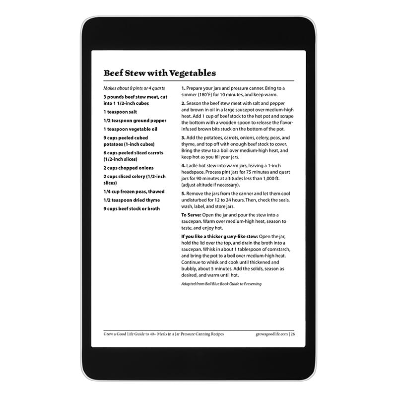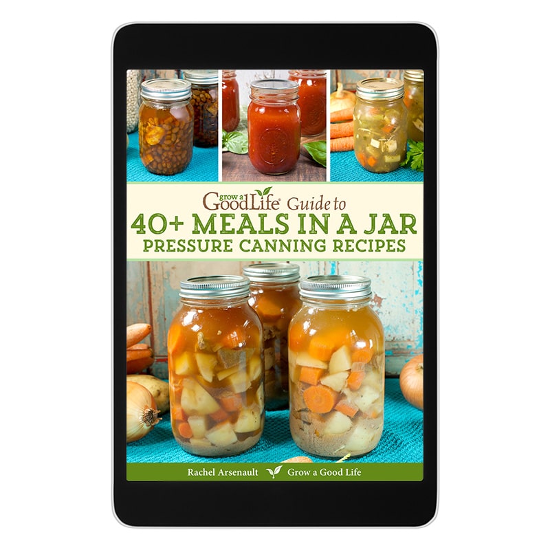 Purchase the PDF eBook, Grow a Good Life Guide to 40+ Meals in a Jar Pressure Canning Recipes, and fill your storage shelves with convenient meals that are easy to heat and eat.